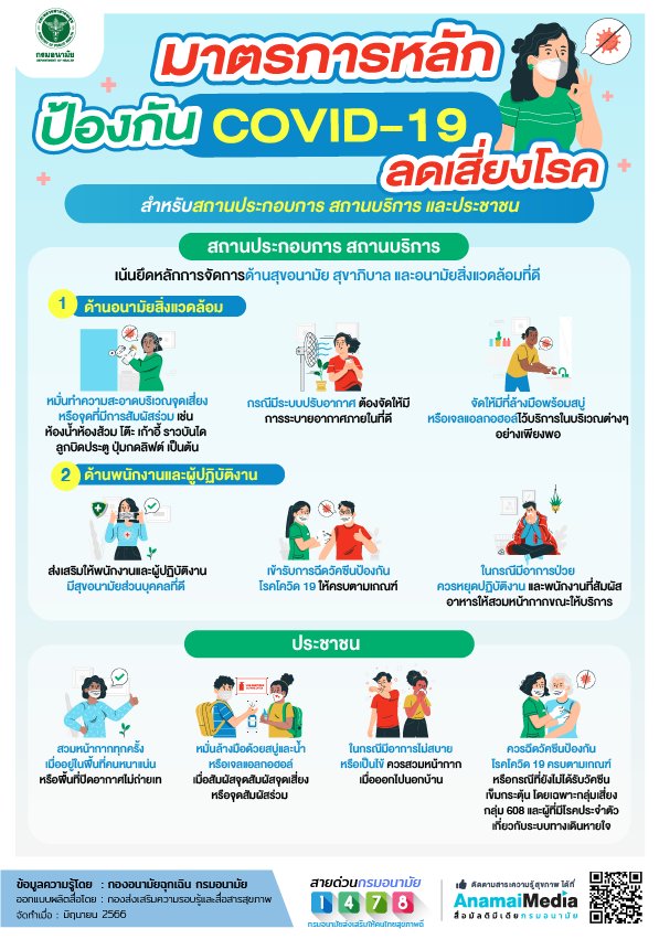 รายละเอียด : เพื่อเป็นแนวทางในการป้องกันและลดความเสี่ยงจากการติดเชื้อไวรัสโคโรนา (COVID-19) สำหรับสถานประกอบการ สถานบริการ และประชาชน