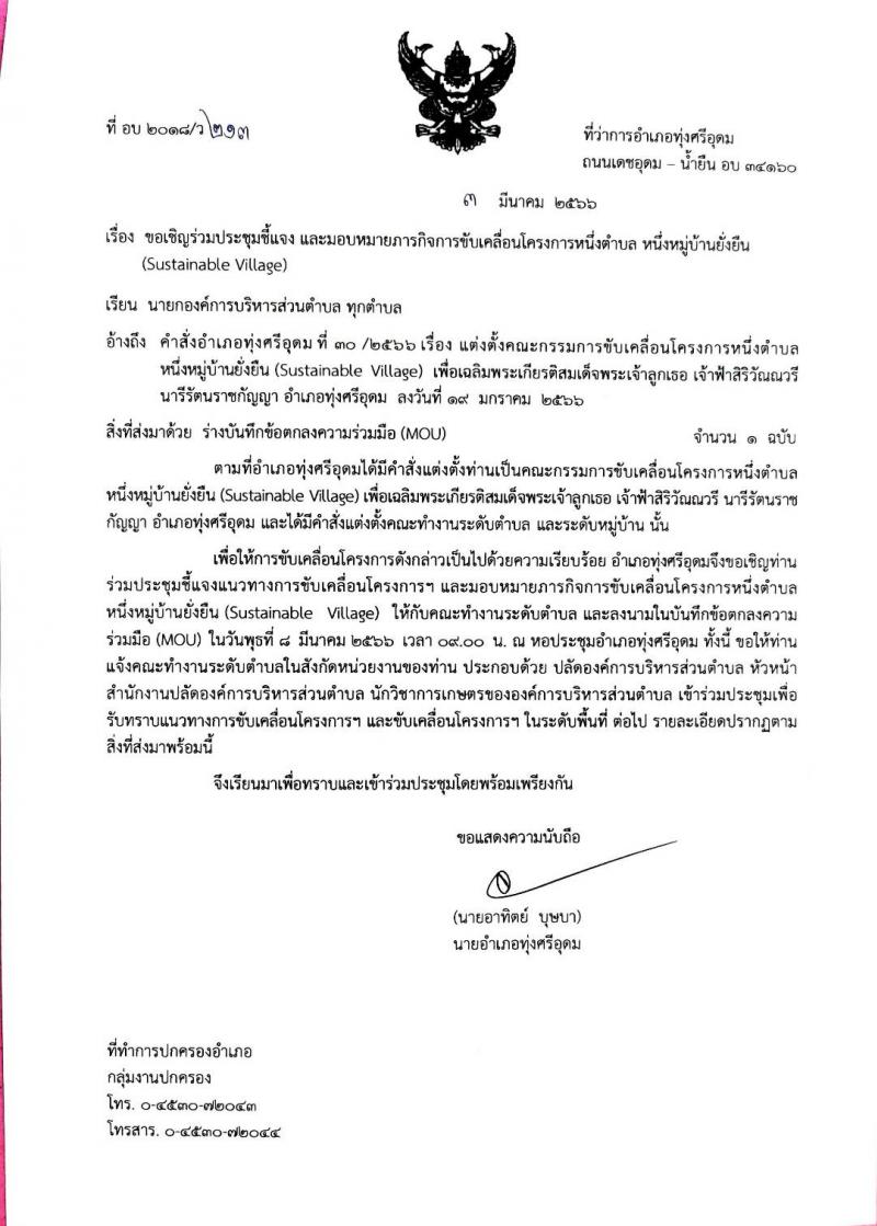 รายละเอียด : วันที่ 8 มีนาคม 2566 เวลา 09.00 น. นายประเสริฐ ณัฐเจริญรัตน์ นายกองค์การบริหารส่วนตำบลหนองอ้ม ได้มอบหมายให้ นางอิศริยา สมพร หัวหน้าสำนักปลัด และนางสาวสายใจ บุญมางำ นักพัฒนาชุมชน เข้าร่วมประชุมชี้เเจงและมอบหมายภารกิจการขับเคลื่อนโครงการหนึ่งตำบล หนึ่งหมู่บ้านอย่างยั่งยืน (Sustainable Village) ให้กับคณะทำงานระดับตำบลและลงนามในบันทึกข้อตกลงความร่วมมือ (MOU) ณ หอประชุมอำเภอทุ่งศรีอุดม โดยหมู่บ้านเป้าหมายในพื้นที่ตำบลหนองอ้ม ได้แก่ บ้านหนองสีขา หมู่ 5