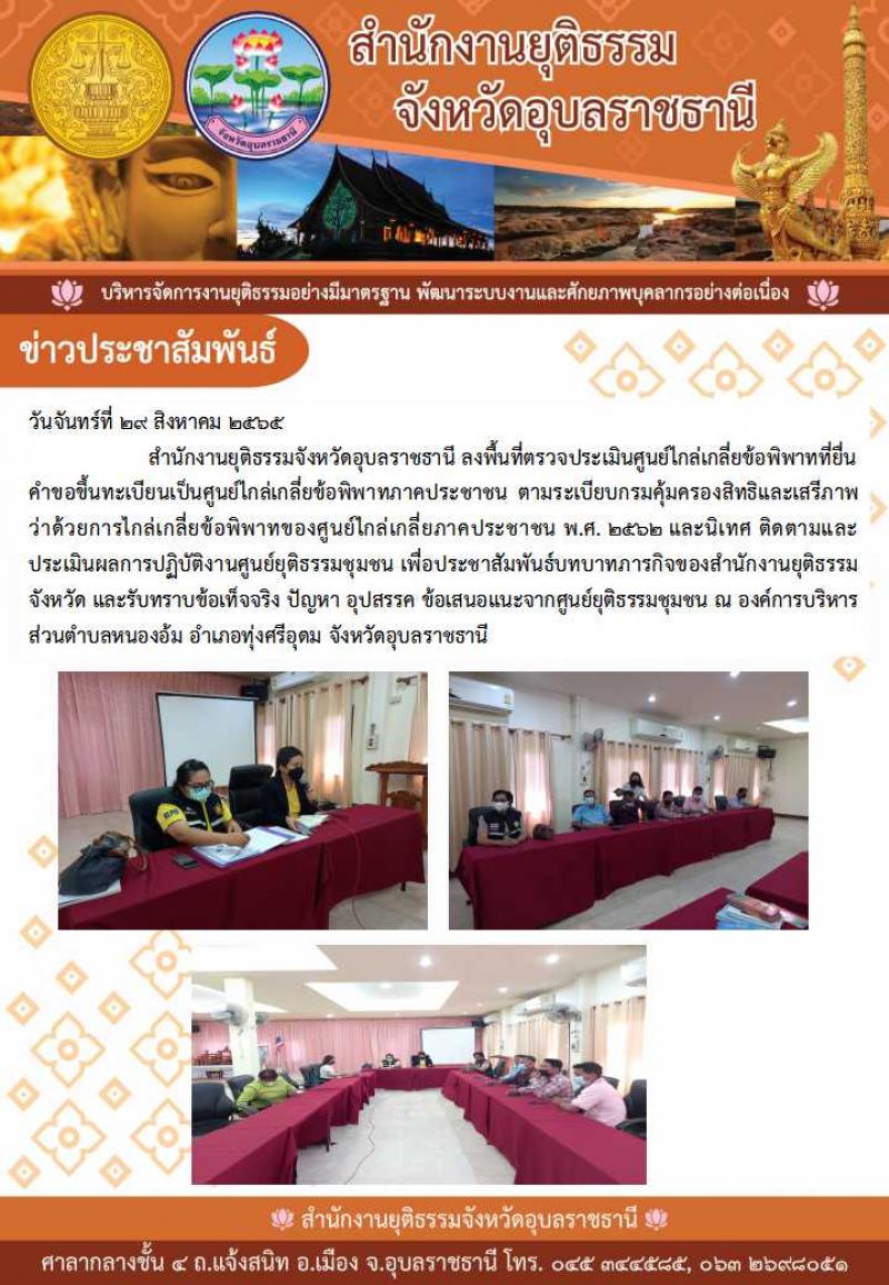 รายละเอียด : วันที่ 29 สิงหาคม 2565 เวลา 14.00 น. นายสะลอง เทนโสภา รองนายกองค์การบริหารส่วนตำบลหนองอ้ม ได้เข้าร่วมรับการตรวจประเมินศูนย์ไกล่เกลี่ยข้อพิพาทที่ยื่นคำขอขึ้นทะเบียนเป็นศูนย์ไกล่เกลี่ยข้อพิพาทภาคประชาชน ตามระเบียบกรมคุ้มครองสิทธิและเสรีภาพว่าด้วยการไกล่เกลี่ยข้อพิพาทของศุนย์ไกล่เกลี่ยภาคประชาชน พ.ศ. 2562และนิเทศ ติดตามและประเมินผลการปฎิบัติงานศูนย์ยุติธรรมชุมชน โดยสำนักงานยุติธรรมจังหวัดอุบลราชธานี เพื่อประชาสัมพันธ์บทบาท ภารกิจ และรับทราบข้อเท็จจริง ปัญหา อุปสรรค ข้อเสนอแนะต่างๆ จากคณะกรรมการศุนย์ยุติธรรมชุมชน